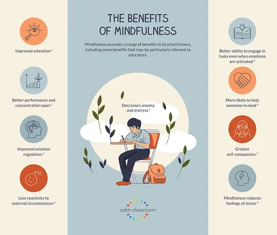 This infographic highlights the wide-ranging benefits of mindfulness, such as reduced anxiety, improved attention, and greater emotional regulation. It’s a concise visual summary of how mindfulness positively impacts mental well-being and academic performance.